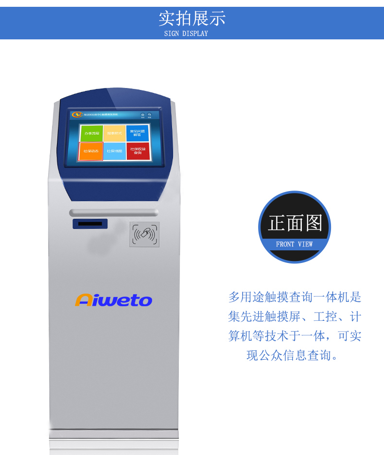 觸摸屏查詢一體機(jī)是一款智能觸摸查詢設(shè)備。它集觸控、液晶顯示、電腦主機(jī)于一體,可用于觸控互動、查詢信息多媒體教學(xué)等。觸摸一體機(jī)主體由流暢的直線構(gòu)成,簡約,時尚,符合現(xiàn)代社會流行趨勢。整體造型設(shè)計利于人體機(jī)學(xué)設(shè)計,使用戶擁有更舒適、更便捷、 更貼心的視覺觸覺雙重體驗。